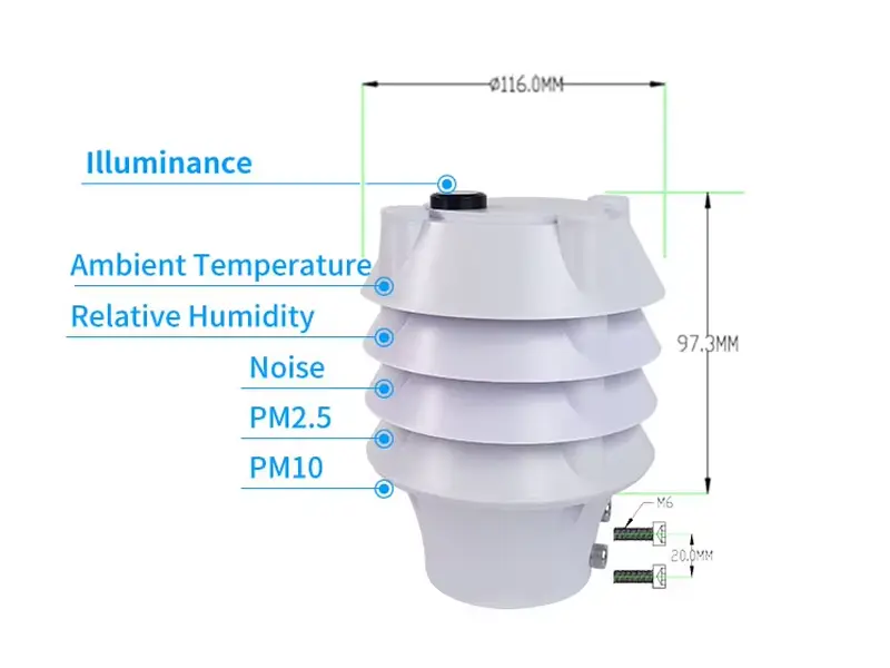 The XF603 best outdoor air quality sensor is a compact six-parameter weather station, integrating atmospheric temperature, humidity, light intensity, noise, PM2.5, and PM10 measurements into a single unit. Achieved through a highly integrated design, it enables 24/7 continuous online monitoring of outdoor meteorological parameters. All six parameters are output to the user simultaneously via a digital communication interface.